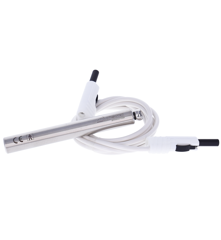 The Protection Detector is a stainless steel rod connected by a 1.5m cable designed for rapid testing of a multitude of ampoules containing various foods or substances. This saves time for the therapist who does not have to place ampoules in the Protection Cup one by one for testing. The Protection Detector provides "protection" for the ampoules in that neither the energy of the therapist nor that of the test subject will be imprinted onto the ampoules, which can thus be re-used repeatedly.