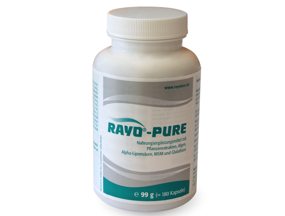 Rayo-Pure 排毒膠囊為潔淨結締組織裏的細胞外基質 (ECM) ,用精選的植物提取物護肝保腎,再溫和地綑綁代謝廢物、毒素和重金屬等,幫助身體將有害物正常排走。藻、螺絲藻、歐芹等有效去除毒素;α-硫辛酸及穀胱甘肽配以維他命C提供抗氧化物質掃除自由基;MSM增加膠原蛋白的製造並提升細胞柔韌度;薑黃素、蕁麻葉、乳薊、朝鮮薊、蒲公英等支援肝、腎、淋巴的排毒功能。